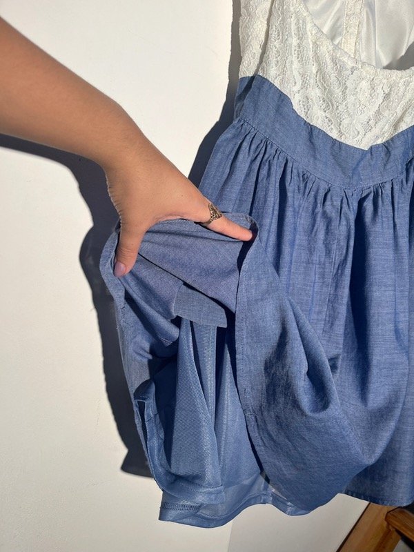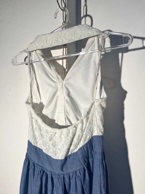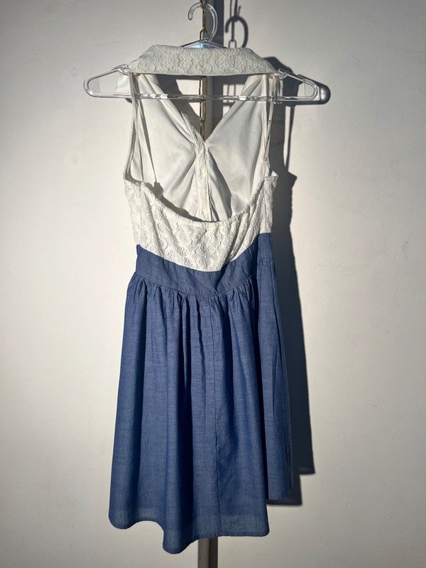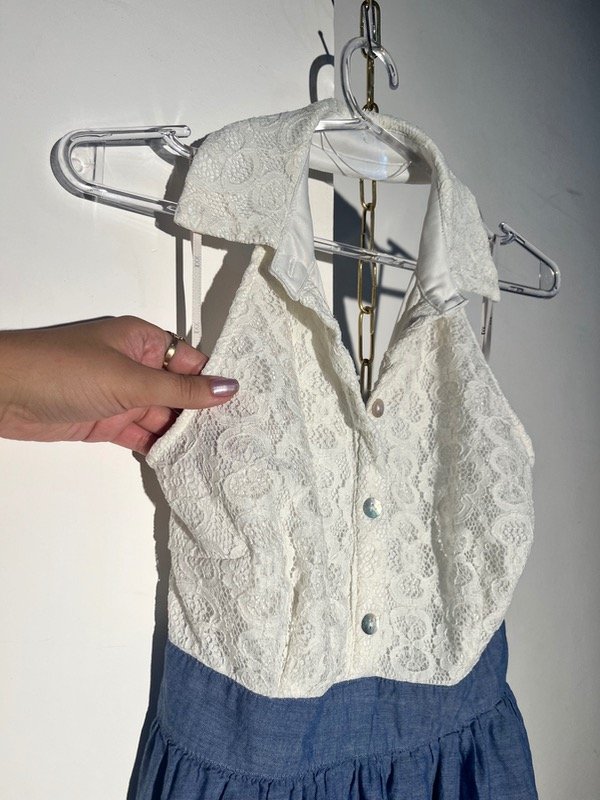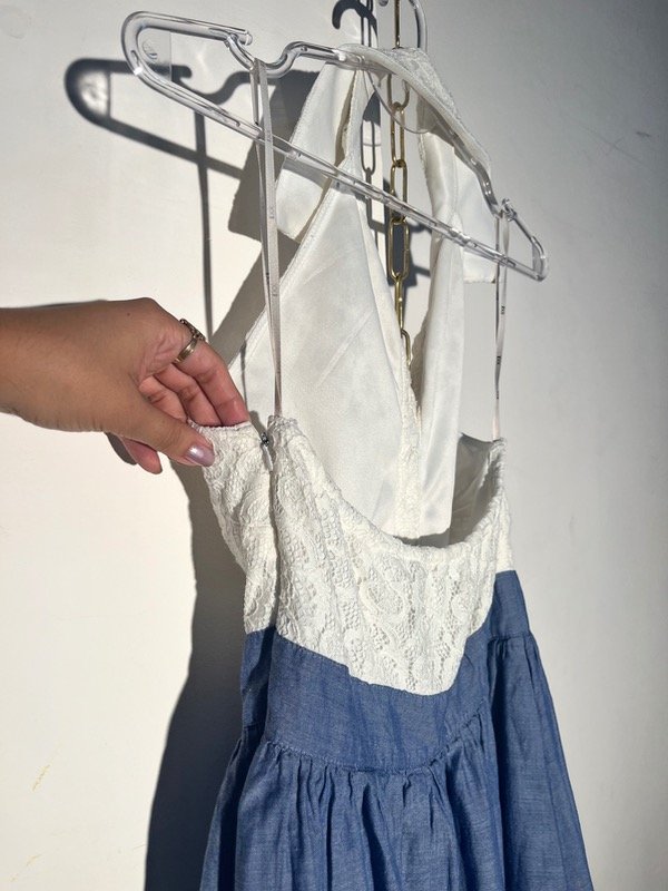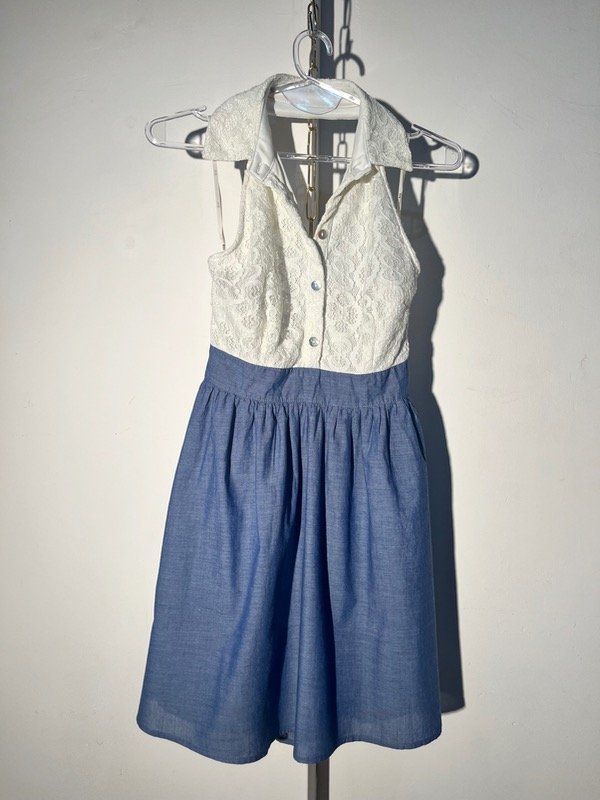 Vestido con cuello tipo chomba con espalda descubierta y elastizada, tiene cierre invisible lateral