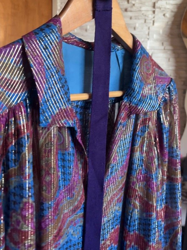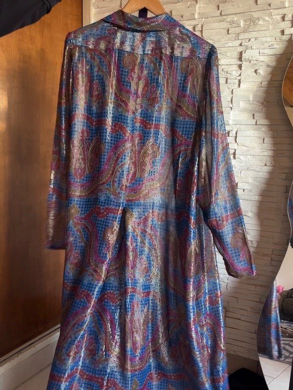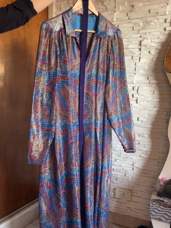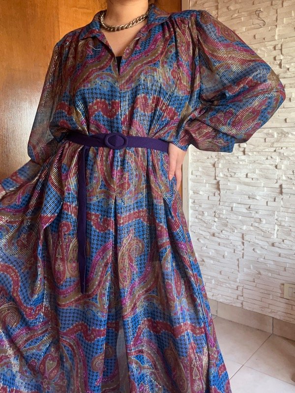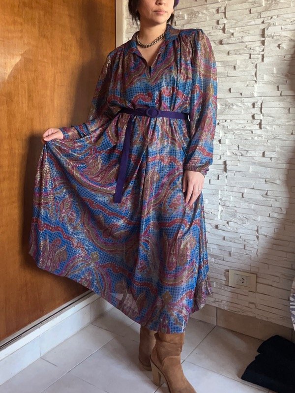 Vestido vintage de seda con hilos de lurex dorado, nuevo sin uso, con detalle a mano y botones forrados , talle L/XL que se adapta a varios talles por su caída, con cinto incluido (yo soy talle S para tener de referencia)